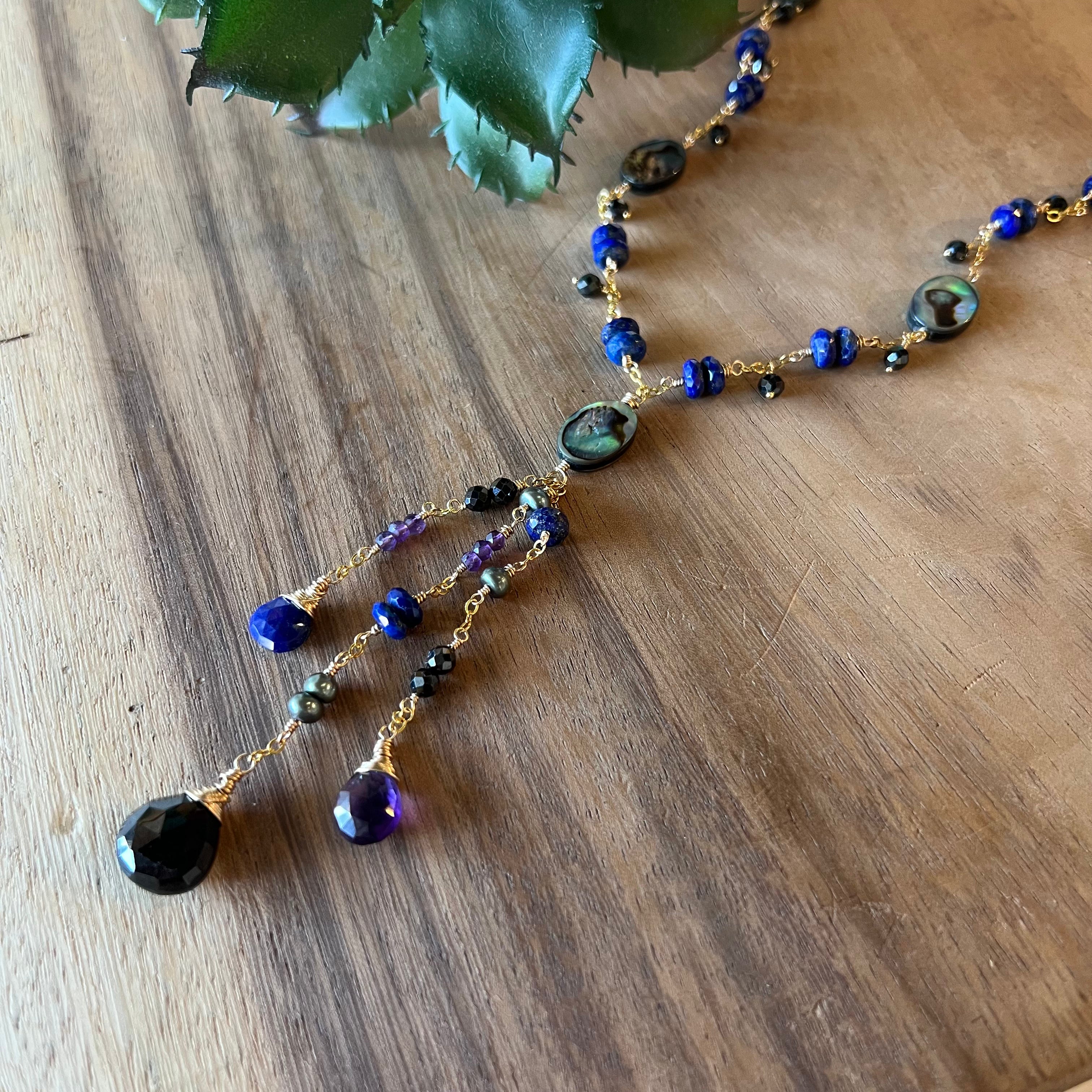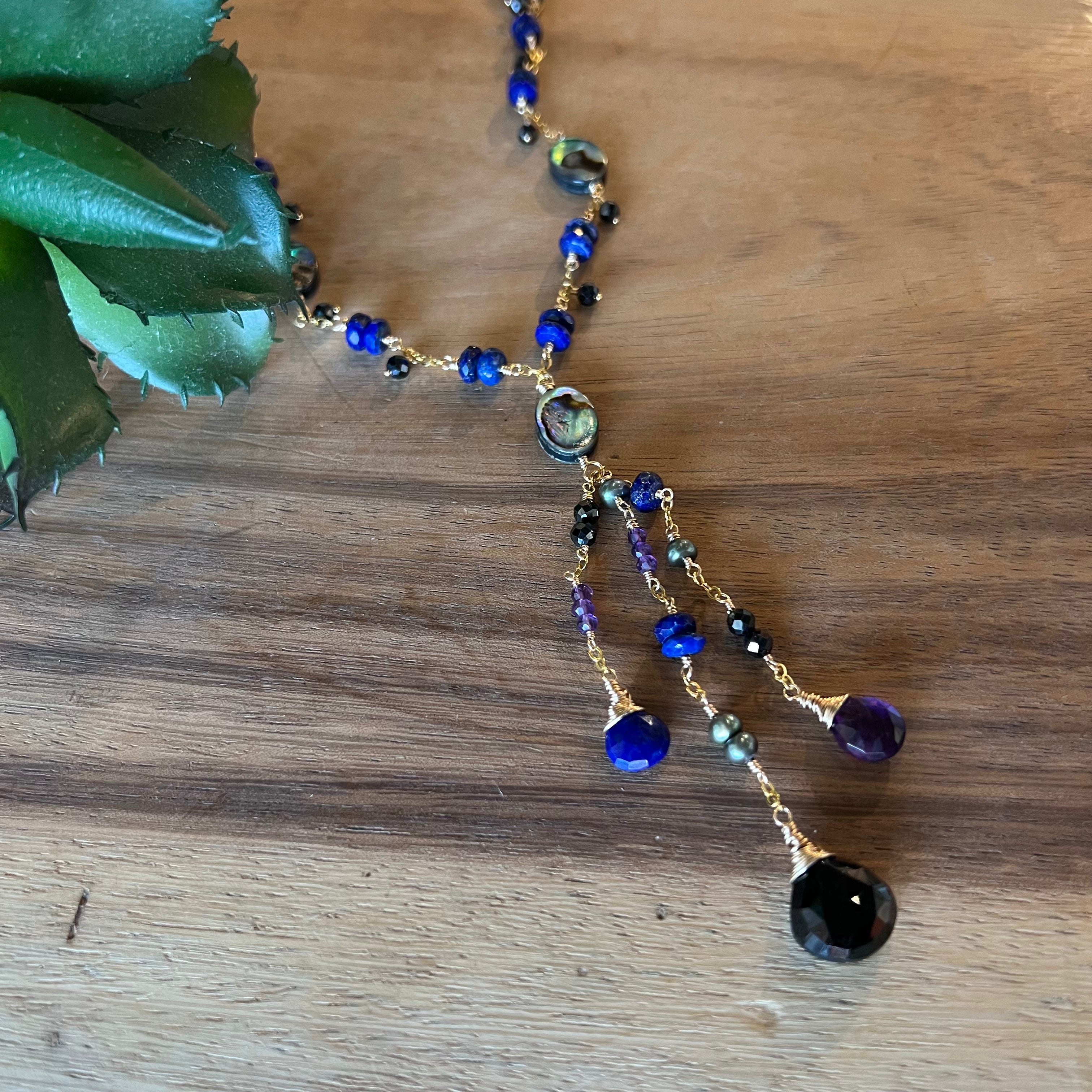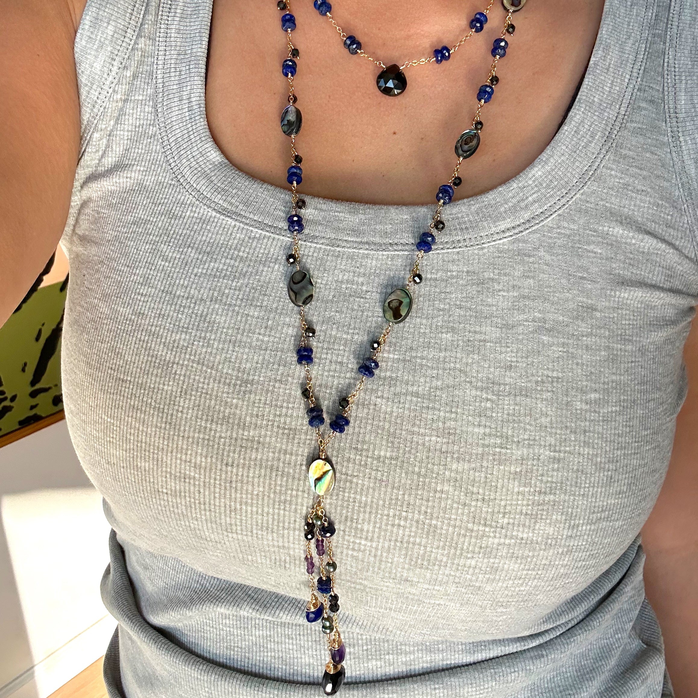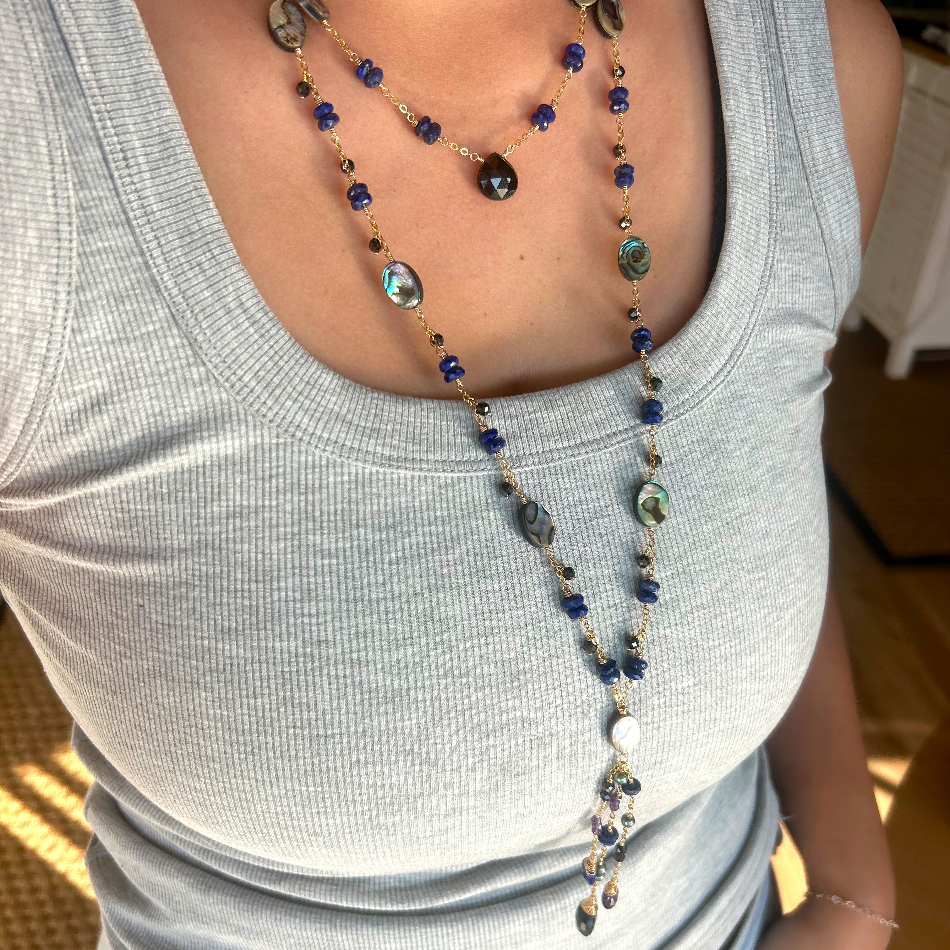 18 kt Gold Vermeil Cable Chain accented with Hand Wrapped Abalone and Lapis on 30" Necklace with Black Spinel accents