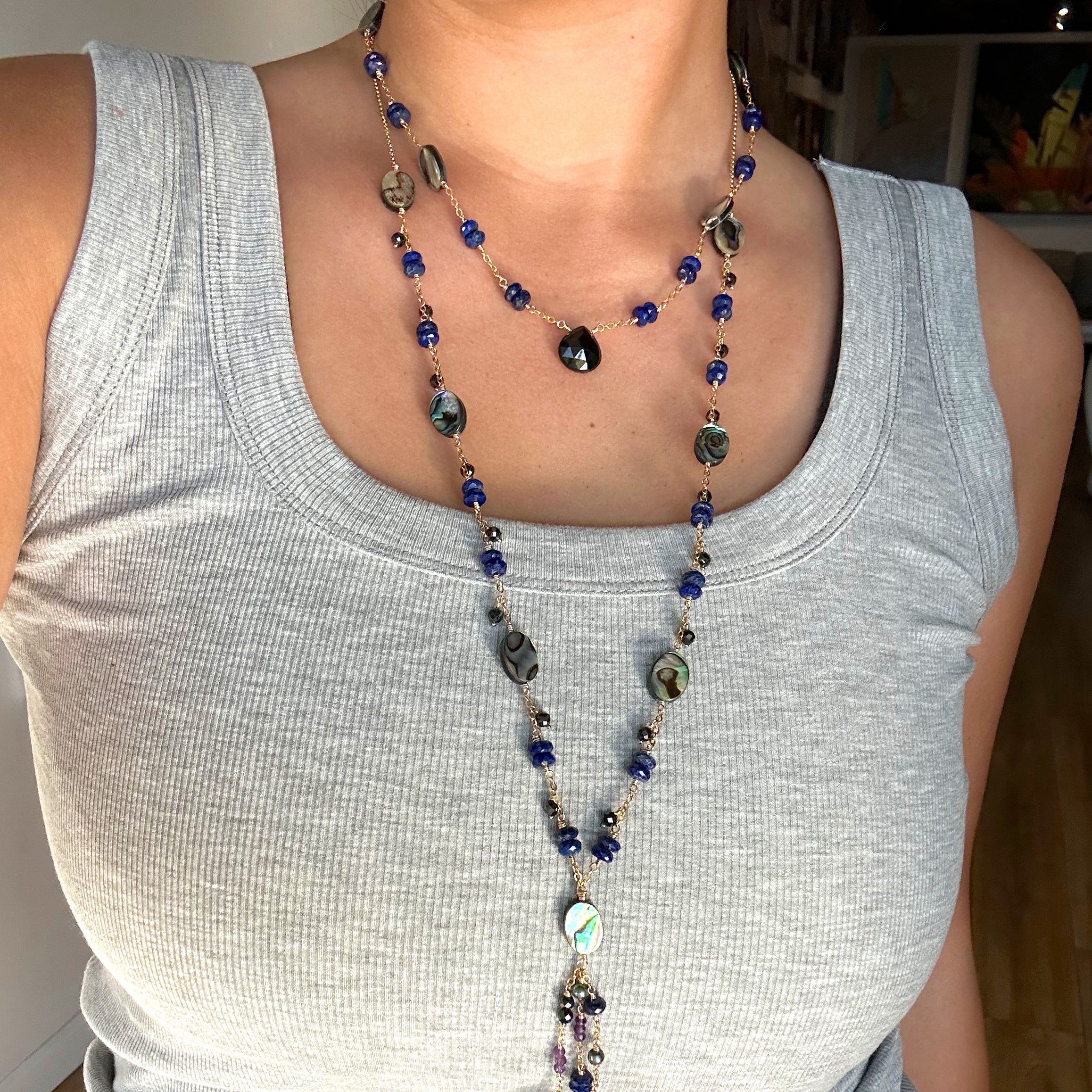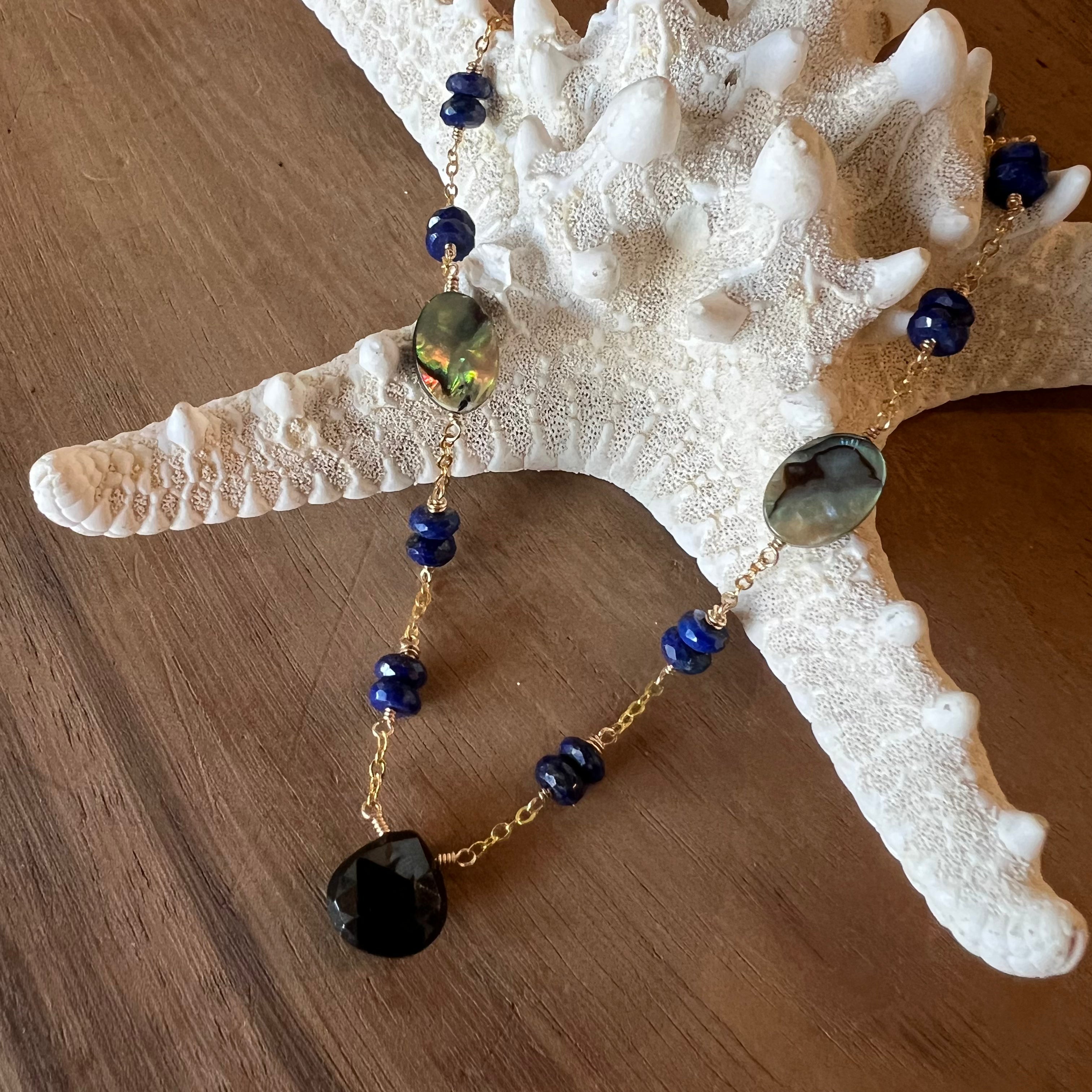 Hand Wrapped Blue Topaz Necklace on 17.5" Gold Vermeil Cable Chain accented with Hand Wrapped Lapis and Abalone with Black Spinel Briolette and Lobster Clasp.