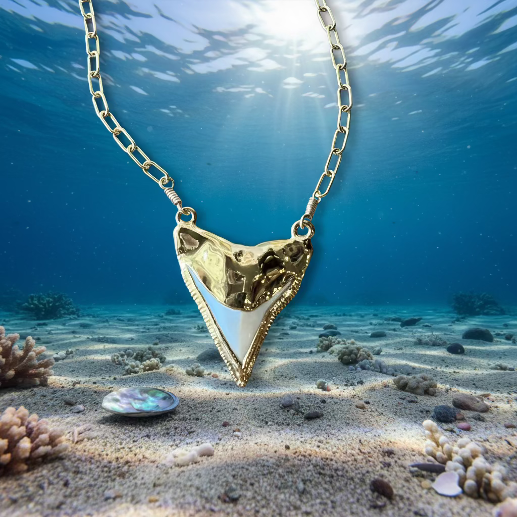 24kt Electroplated Shark Tooth Double Bail Necklace on 18 kt Gold Vermeil Paperclip Chain with Lobster Clasp . The type of tooth is Bull Shark, found locally on the shores of North Florida